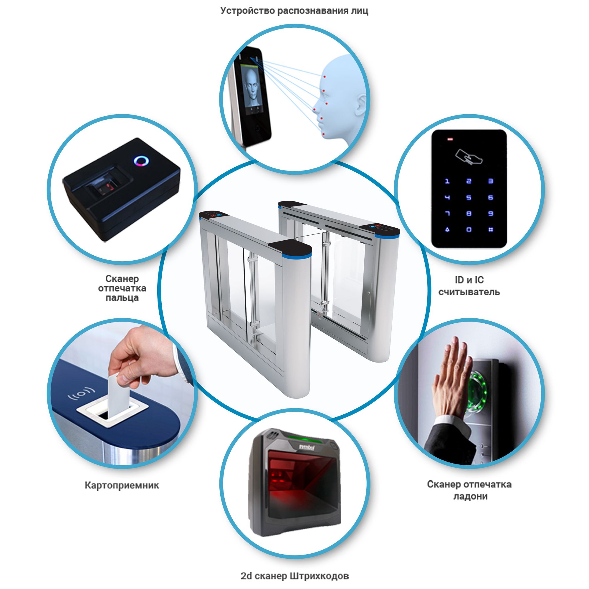 Интеграция оборудования возможна благодаря реле для управления устройствами («Сухие контакты»). К исполнительному устройству можно подключить стороннее оборудование: металлодетекторы, пожарная система безопасности и др. Также обеспечивается исправная работа при интеграции с устройствами других производителей. Интеграция турникета через «Сухие контакты» способствует налаженной работе всего оборудования. В случаях проноса запрещенного предмета на охраняемую территорию, поступает сигнал турникету с устройства, которое зафиксировало нарушение, и исполнительный механизм автоматически блокирует проход. При срабатывании сигнала пожарной тревоги или сбое электропитания включается функция разблокировки выхода «Антипаника». Эта функция автоматически реагирует в экстренных случаях и открывает створки для свободного передвижения людей. Также она может быть активирована с пульта ДУ. Базовая комплектация распашного турникета РСП 500 включает в себя два электронных картосчитывателя. Турникет РСП 500 можно дополнить устройствами идентификации: биометрические СКУД, картоприёмники, сканеры штрих-кода и пр.